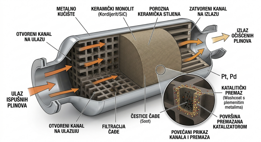 DPF je keramički filtar smješten u ispušnom sustavu vozila, čija je primarna zadaća hvatanje mikroskopskih čestica čađe, produkta nepotpunog izgaranja dizelskog goriva. Ove čestice, poznate i kao PM (Particulate Matter), predstavljaju ozbiljnu prijetnju ljudskom zdravlju i okolišu, doprinoseći respiratornim bolestima i zagađenju zraka. Struktura DPF-a podsjeća na saće, s malim kanalima koji su naizmjenično zatvoreni, prisiljavajući ispušne plinove da prolaze kroz porozne stijenke filtra, gdje se čađa zadržava.